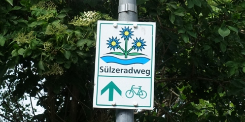 Auf dem Wegweiserschild des Sülzeradweges sehen wir die dreiblütige Salzblume aus dem Sülzetal-Wappen.