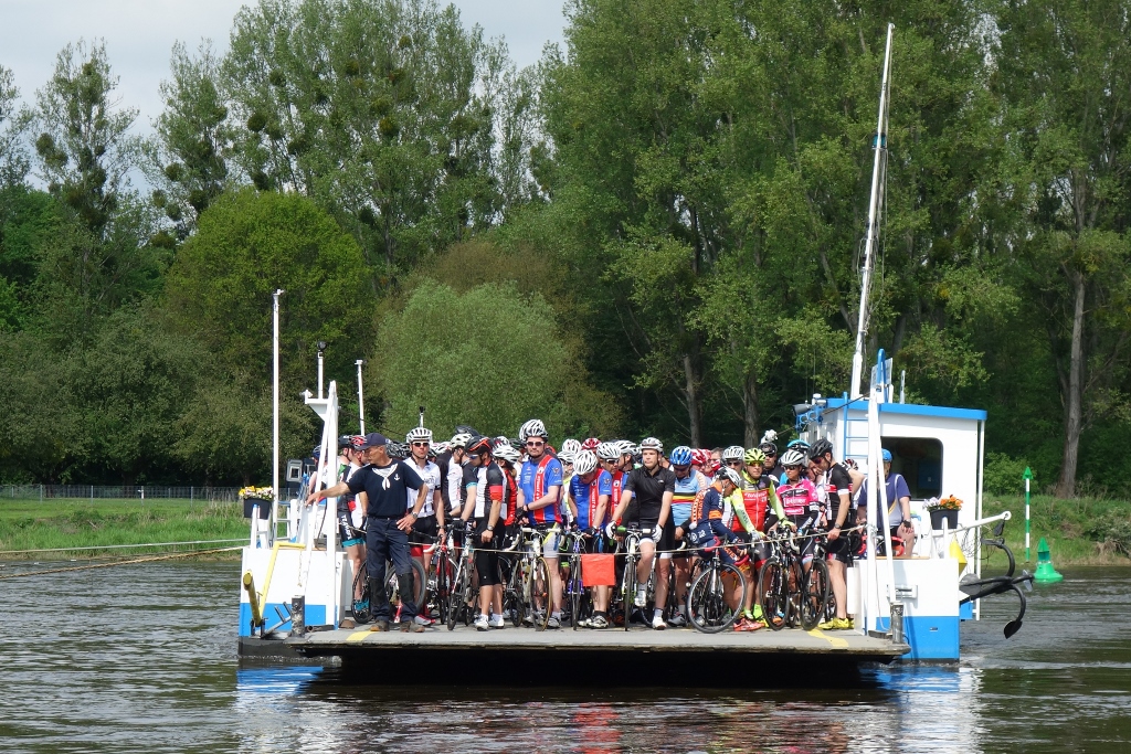 Circa 150 Radler setzen während der Radrundfahrt „Rund um Dessau“ mit der Fähre Coswig über die Elbe. Die Fähre war voll!