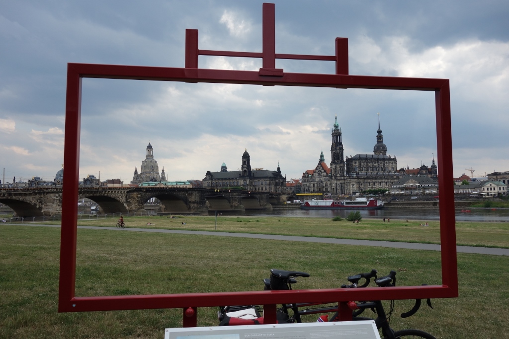 Nach diesen zwei Türmen trafen wir uns mit unserer Tochter und landeten schließlich viel erzählend beim Italiener. Dann radelten wir wieder ins Elbtal und entdeckten diesen Fotorahmen.